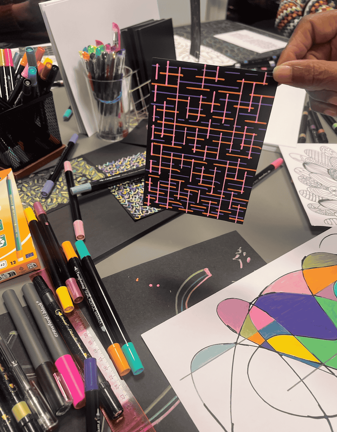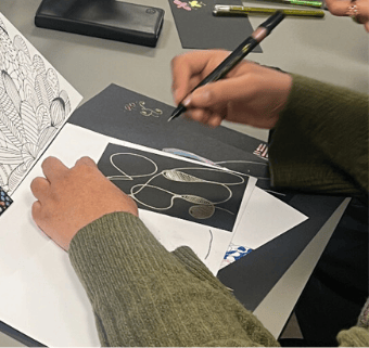We set up a calm, non-clinical creative station in your office space (e.g., a meeting room or breakout area) for a set window. Your staff can drop in for 10, 20, or 30 minutes during their break to decompress, pick up a pen, and reset their nervous system before returning to work.
